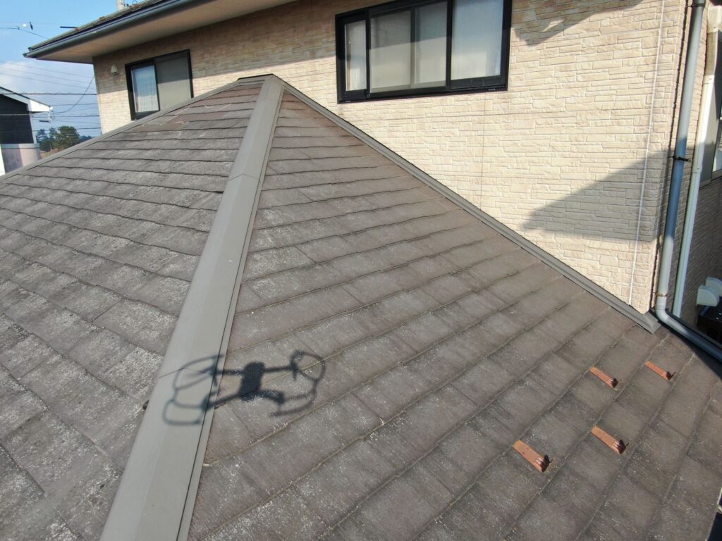 ドローンで撮影した屋根の様子です。元の色がわからなほど退色して、スレート本体の色が目立つ部分もありました。高所からの視認が難しい屋根もドローン撮影によって劣化状況を的確に把握することができます。