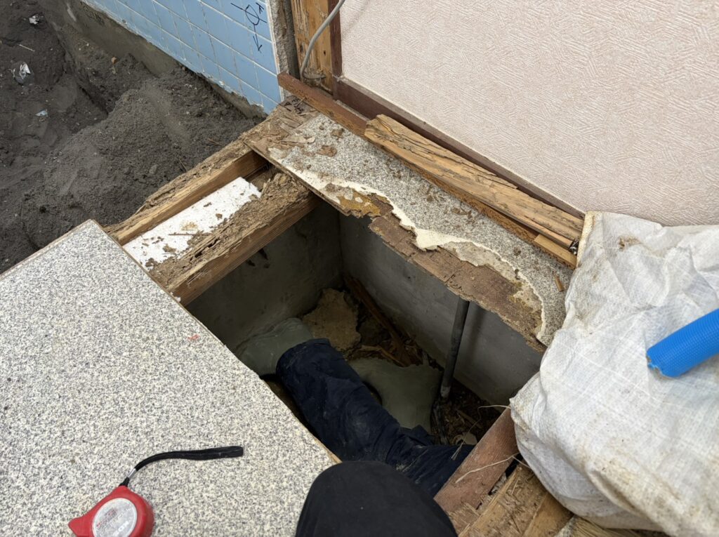調査を行ったところ、脱衣所床下にシロアリ被害が見つかり、見えない部分で劣化が進んでいることが分かりました。このまま使用を続けることは不安があるため、床の修繕とあわせて洗面台の取替をすることになりました。 -