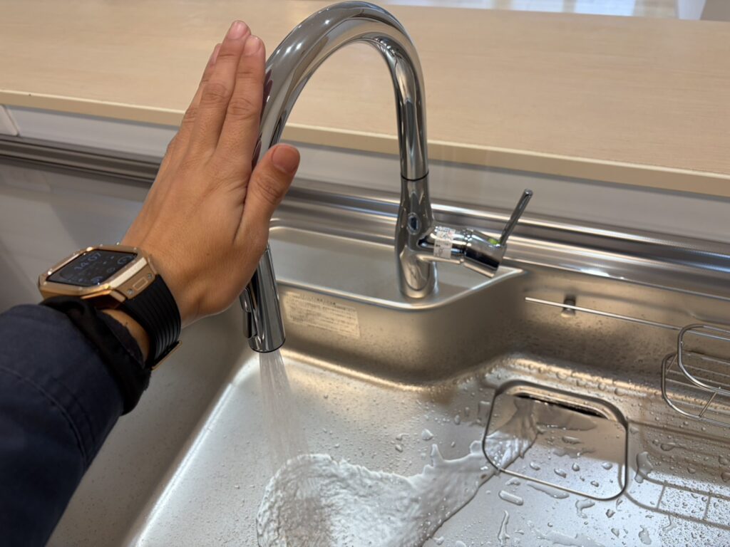 タッチレスハンドシャワー水栓は、センサーに手をかざすと、レバーにふれることなく吐水・止水ができます。汚れた手でレバーを触らなくていいので、レバーが汚れません。また、菌も付きにくく清潔です。