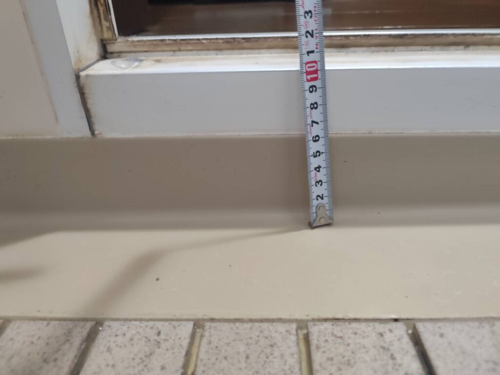 浴室の出入り口には段差があり、出入りの際に足元へ注意が必要な状態です。